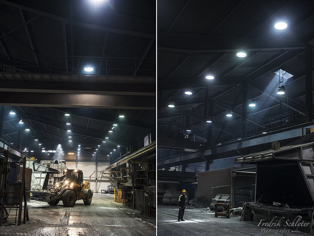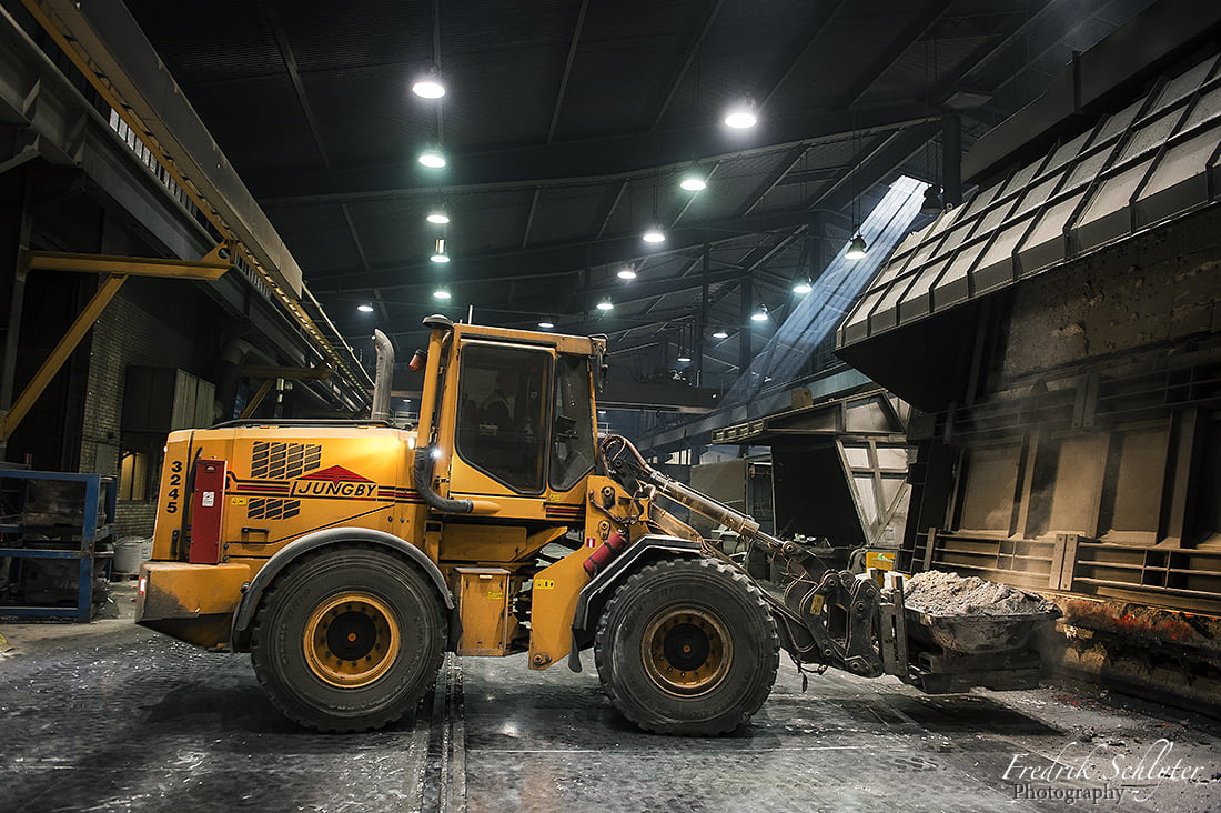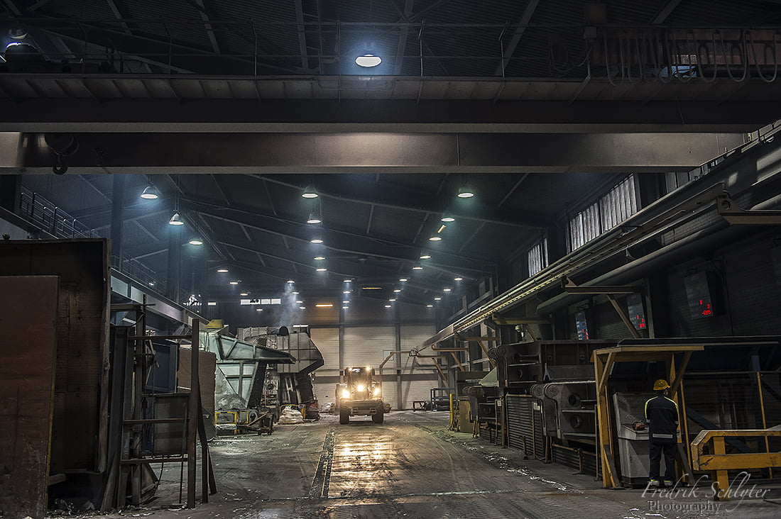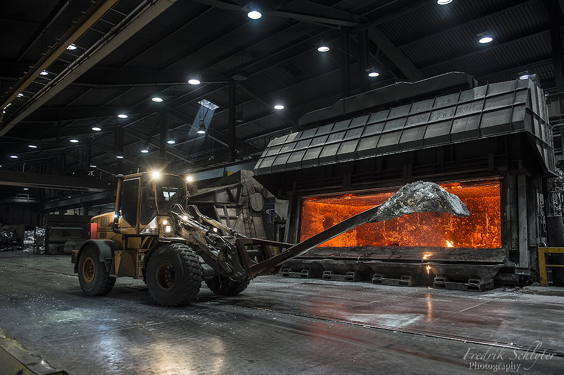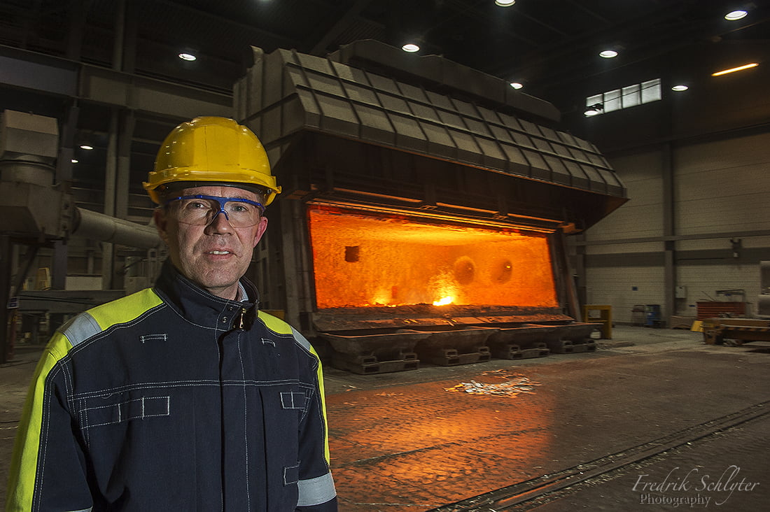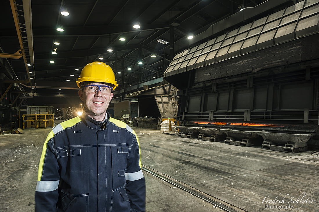 Industrifotografering Gränges i Finspång. Fotouppdraget var att dokumentera arbete kring smältugnen samt en porträttfotografering av Anders Johansson framför smältugnen.
